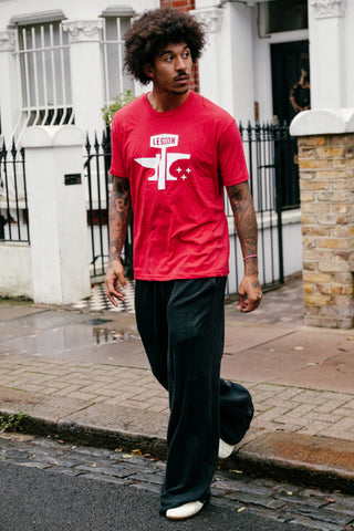 This is our Legion FC Anvil Tee (Red). It was designed to create a fun look with one of our hammer and anvil logos displayed on the front. Standard fit that fits true to size.